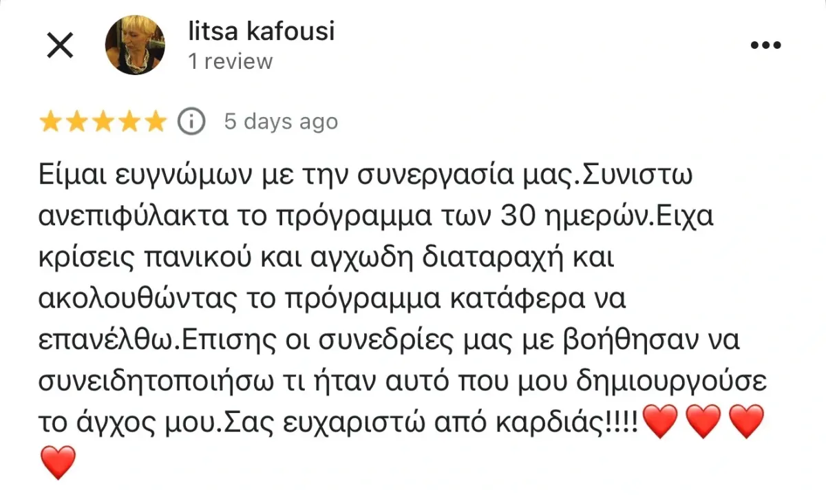 Υπάρχουν διαθέσιμες ώρες που καλύπτουν όλα τα ωράρια, ώστε να μπορείς να εντάξεις τη συνεδρία στο πρόγραμμά σου χωρίς πίεση.